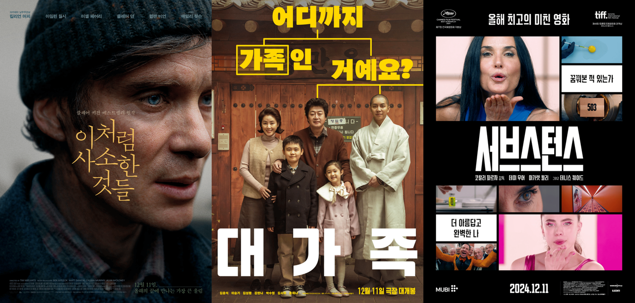 2024년 12월 둘째 주 개봉 영화는 <이처럼 사소한 것들>, <대가족>, <서브스턴스>다.